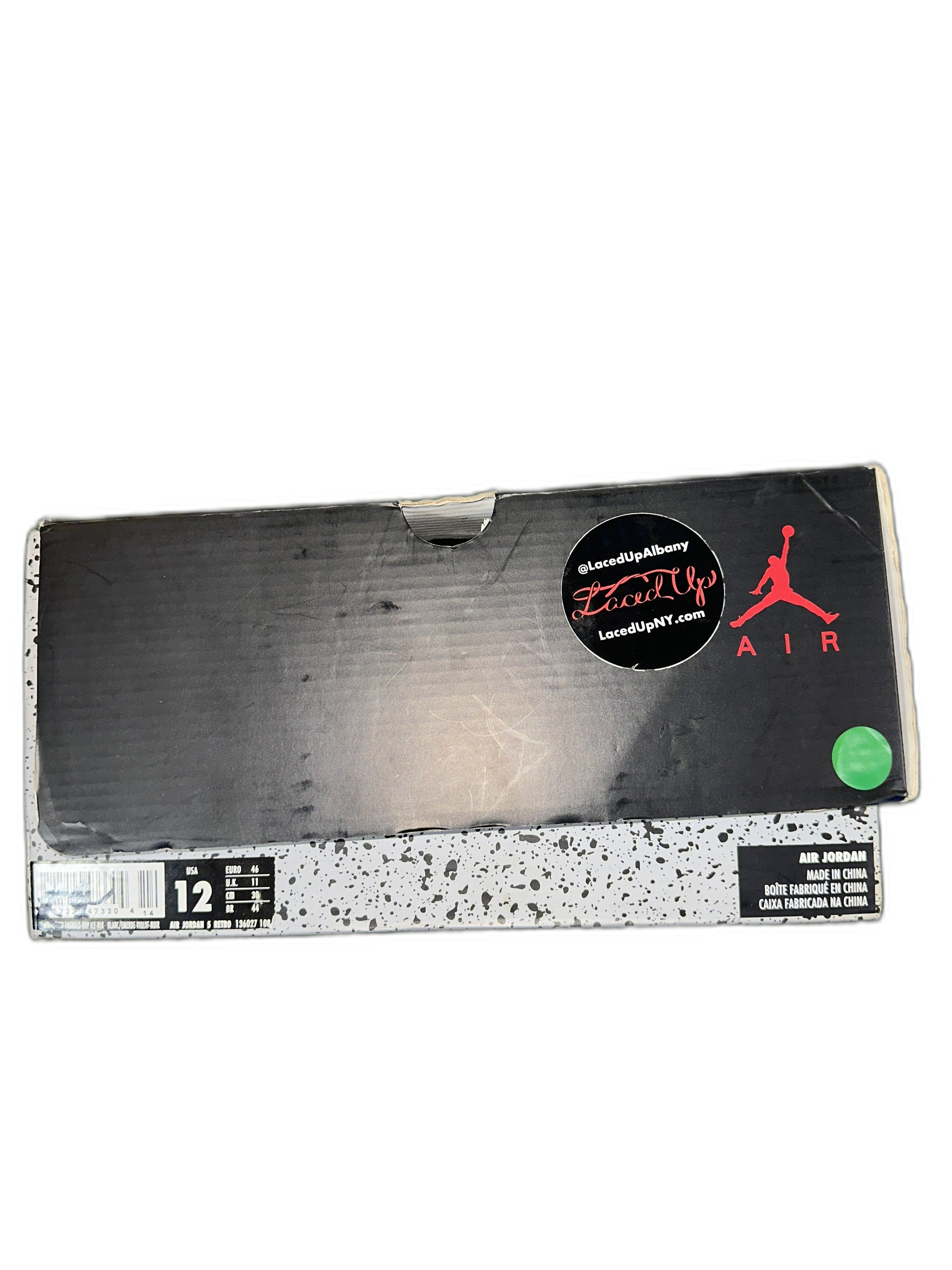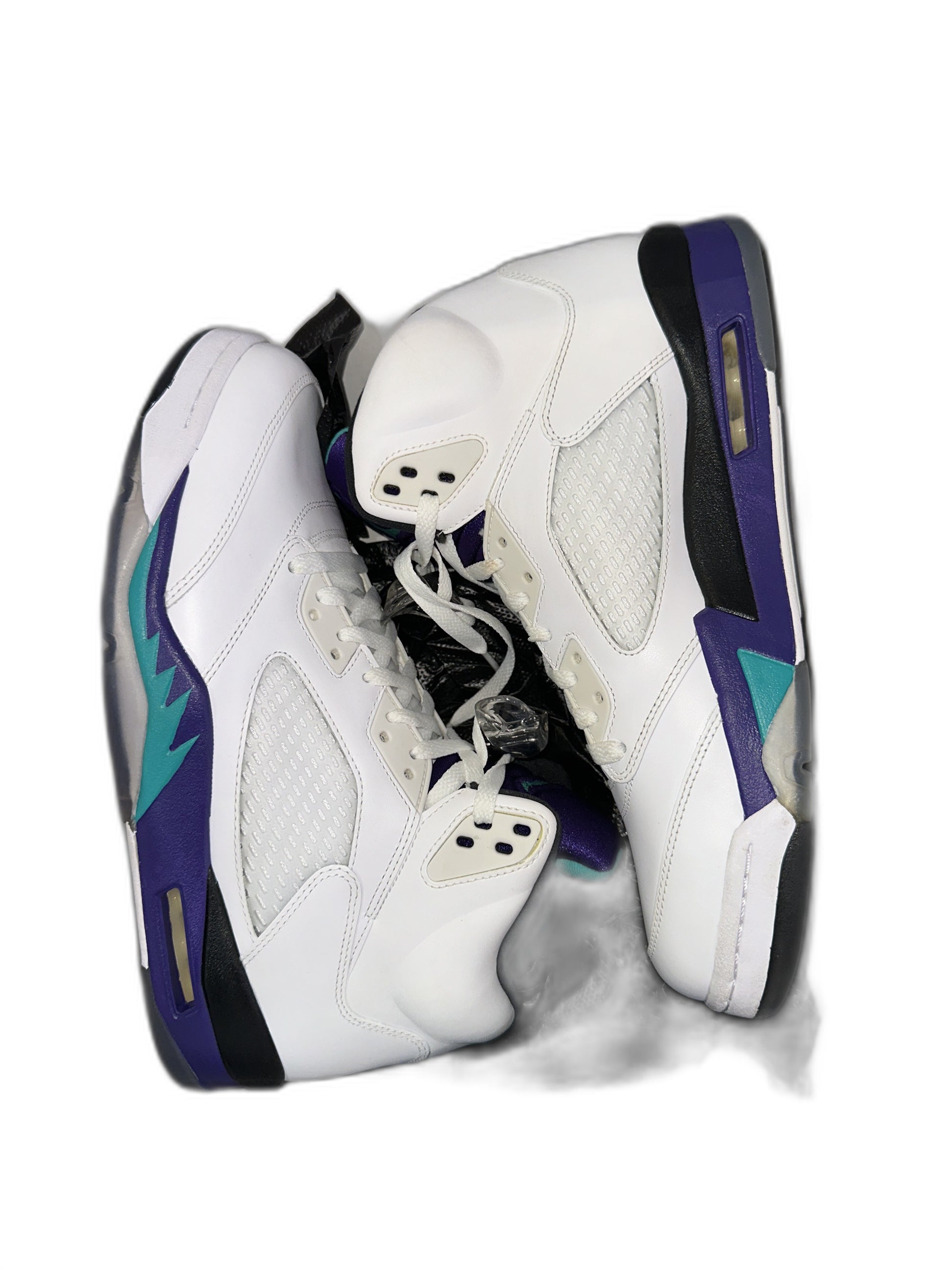 The Grape Air Jordan 5 2013 in white is a new pair of men's size 12 sneakers. This model is a classic release by Jordan, noted for its style and comfort.