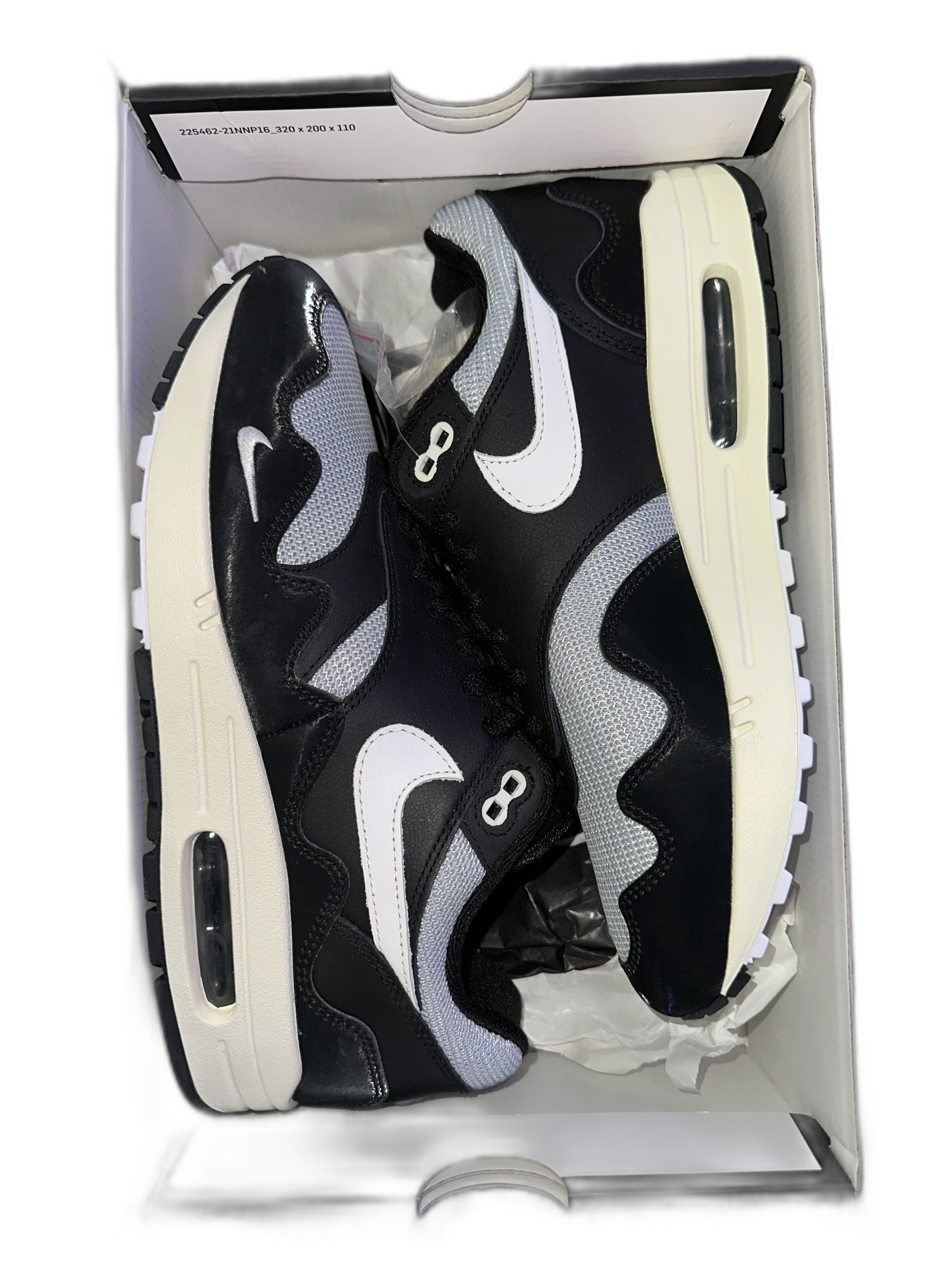 The Nike Air Max 1 Patta Black is a new pair of men's sneakers in size 9, also corresponding to a women's size 10.5. These shoes come in a sleek black color with model number DQ0299001.