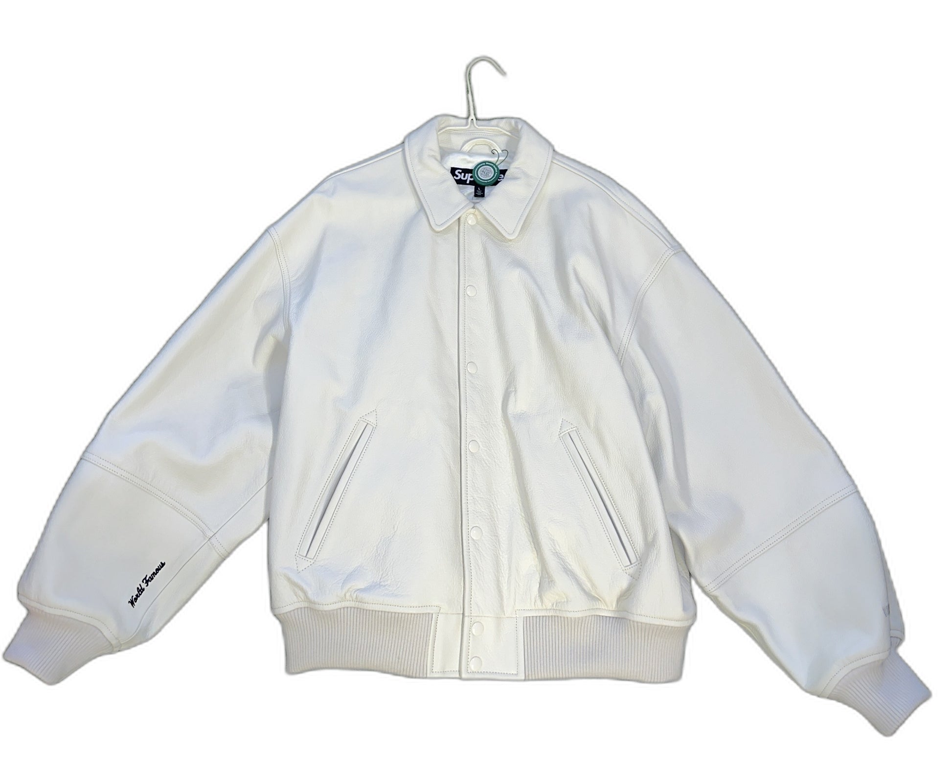 This Supreme GORE-TEX Infinium WINDSTOPPER Leather Varsity Jacket in white is a new item in excellent condition.