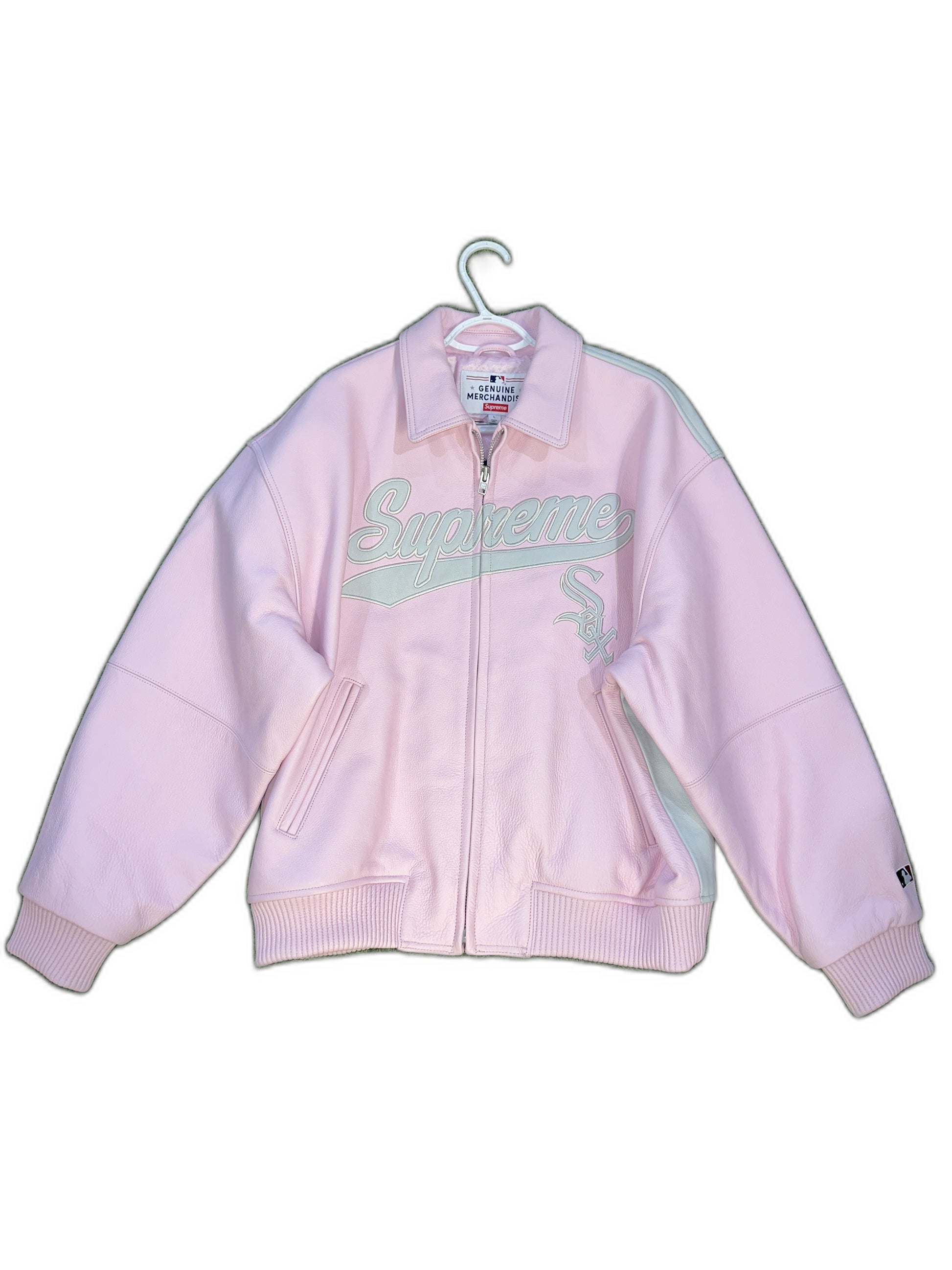 This listing is for a new Chicago White Sox™ Leather Varsity Jacket by Supreme in pink.